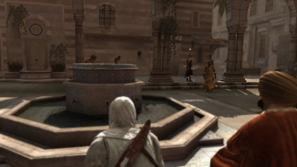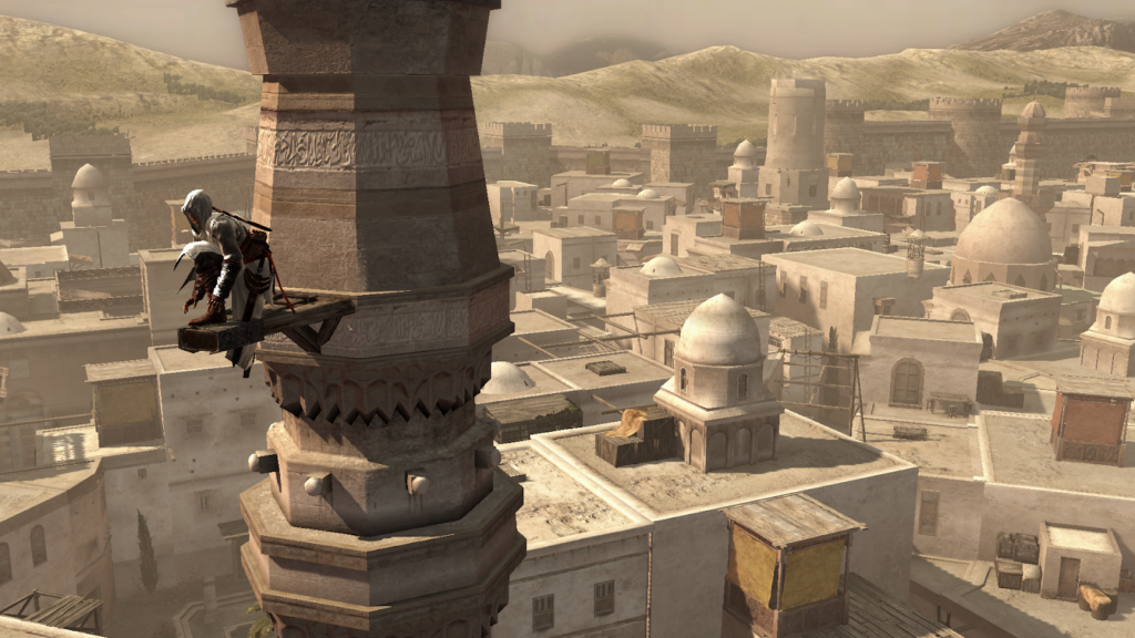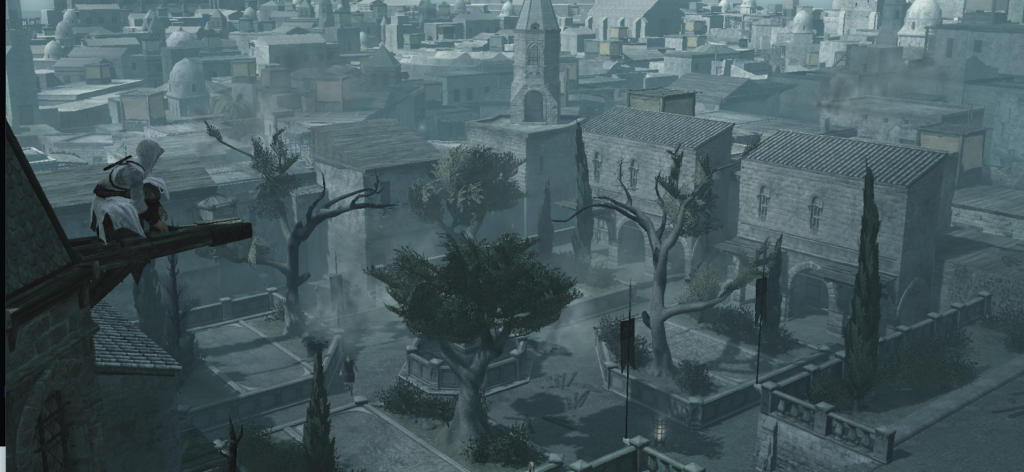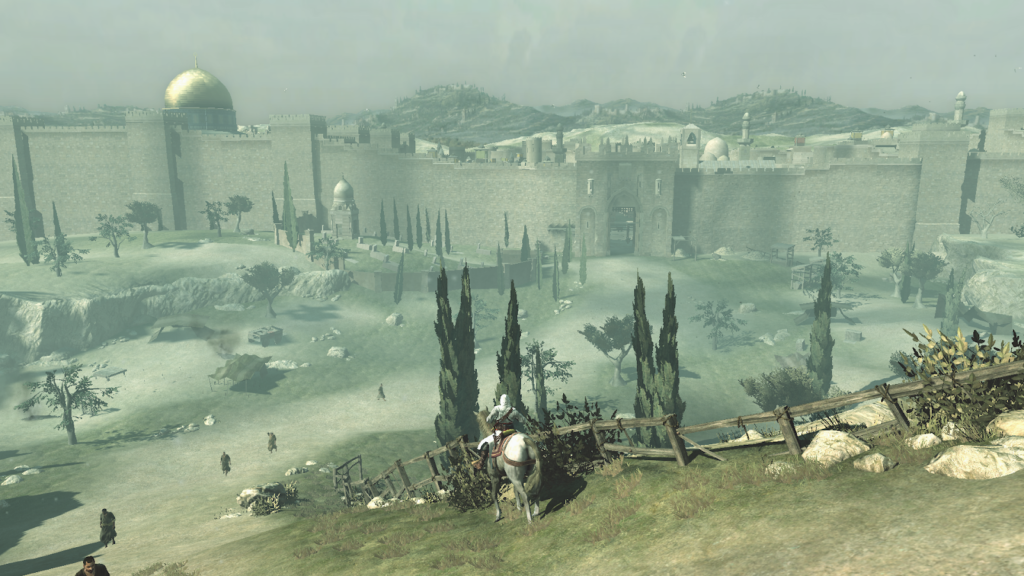 Outro aspecto que é muito certeiro em Assassin’s Creed é a ambientação, ou melhor, as ambientações. O Jogo se passa em três cidades principais: Acre, Damasco, e Jerusalém (além de Masyaf, a cidade governada pelos Assassinos). É interessante ver como cada uma tem uma espécie de identidade própria, algo que acaba refletindo inclusive na tonalidade de cores que é utilizada em cada uma delas. Enquanto Acre é mais acinzentada e mais sombria, Damasco fica num tom de amarelo e laranja, que passa uma ideia de vivacidade, e Jerusalém fica no meio-termo entre as duas, num tom mais azulado. Aliado a isso, é interessante ver o cuidado que a Ubisoft possuí para fazer essas locações o mais crível possível, tornando-as quase verossímeis mesmo, algo que é impressionante.