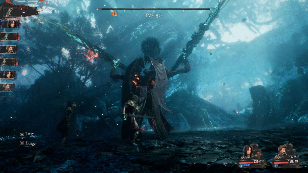 O sistema de combate é onde Clair Obscur realmente inova. Ele combina mecânicas clássicas de RPG por turnos com elementos de ação em tempo real, exigindo reflexos rápidos para esquivas, aparos e contra-ataques via Quick Time Events. O resultado é um sistema dinâmico, desafiador e muito envolvente, que transforma cada batalha em uma espécie de dança estratégica.