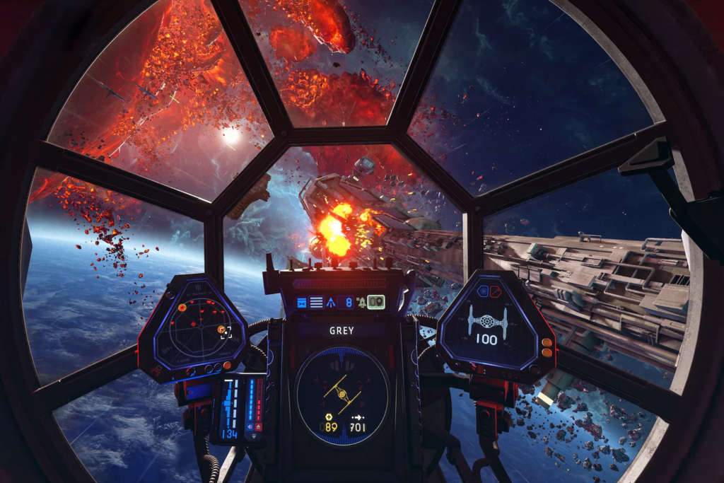 Pilote seu caça estelar: Os jogadores assumem o controle direto de um caça estelar, com a capacidade de manobrar em todas as direções, acelerar, desacelerar e realizar várias manobras para escapar de perigos ou se posicionar para o ataque.