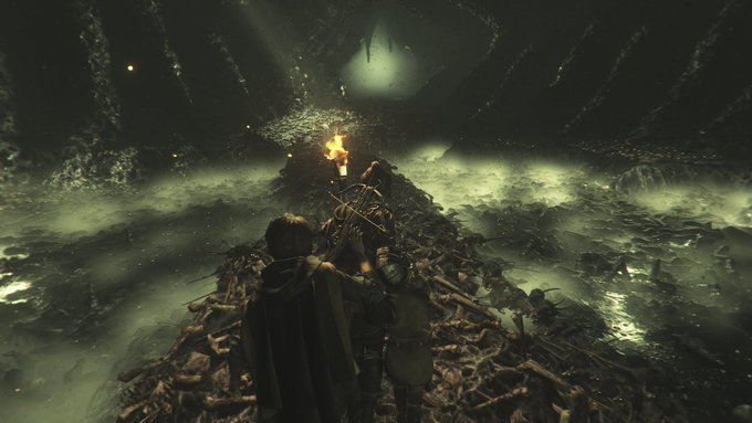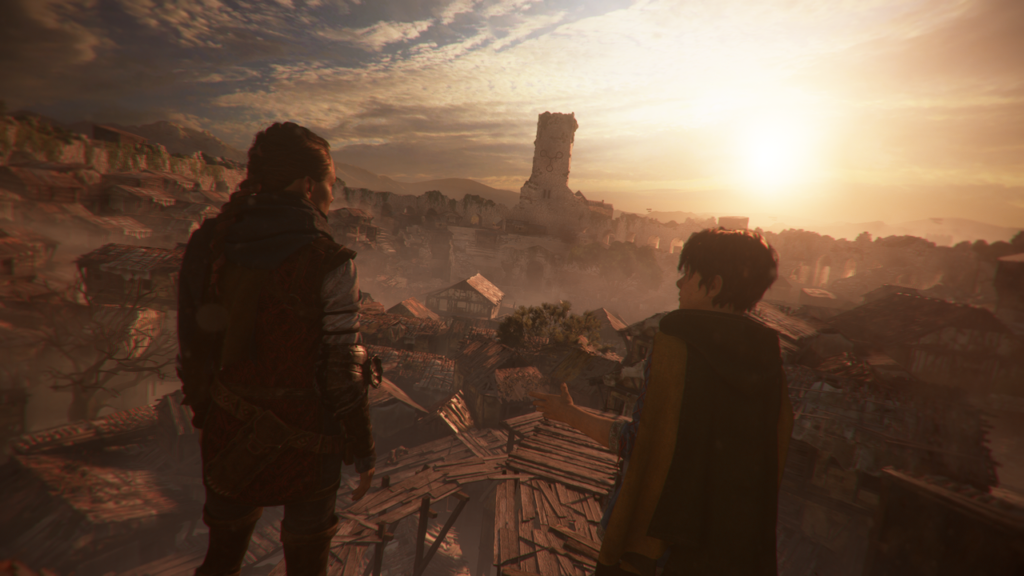 Falando brevemente sobre a campanha do game, sem dar muitos spoilers, ou falando dos pontos chaves pois é muito melhor você jogar e ir descobrindo mais sobre ela conforme for passando o jogo. Bom, antes de qualquer coisa é importante ressaltar que como Requiem é uma sequência é importante que você tenha jogado o A Plague Tale: Innocence para entender melhor toda a situação. A História de A Plague Tale: Requiem trabalha muito bem algo que tinha no primeiro jogo que era a relação dos irmãos Amícia e Hugo, ao passar da história podemos ver como Amícia ama seu irmão e que vai fazer de tudo para o ajudar. Podemos perceber também que temos uma evolução nos personagens, por exemplo a própria Amícia que no primeiro jogo ao matar se sentia mal por isso, já nesse novo jogo ela se acostumou e virou uma questão de às vezes algo que deve ser feito. A narrativa desse jogo está bem melhor, trazendo novos personagens e deixando a trama mais rica. Inclusive a trama do jogo de forma resumida gira em torno de encontrar uma cura para a mácula do Hugo. É no meio dessa jornada que encontramos novos aliados e inimigos. Espere grandes reviravoltas desse jogo, a história foi muito bem construída e principalmente os capítulos finais do jogo que vão ser bem intensos e vão mexer com você.